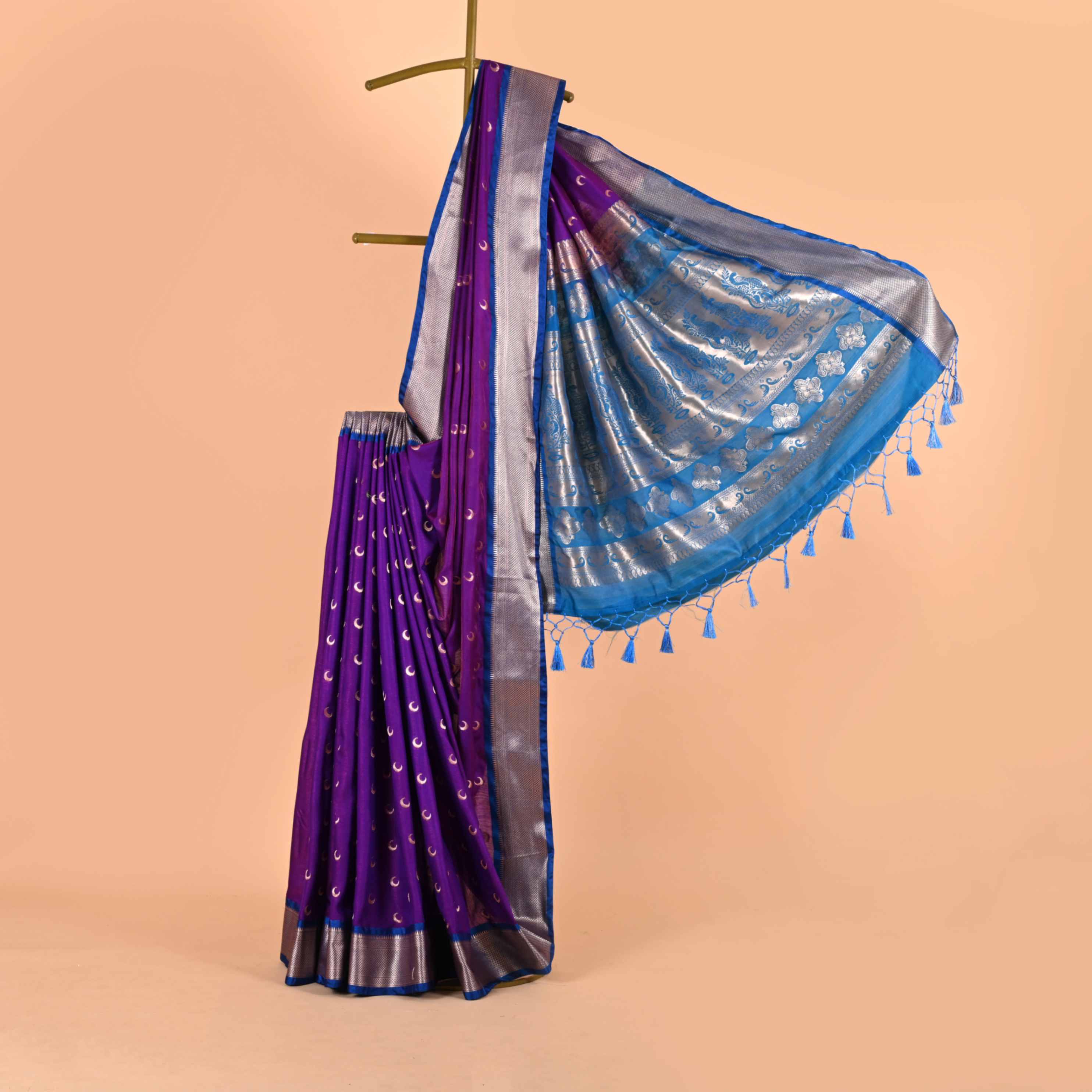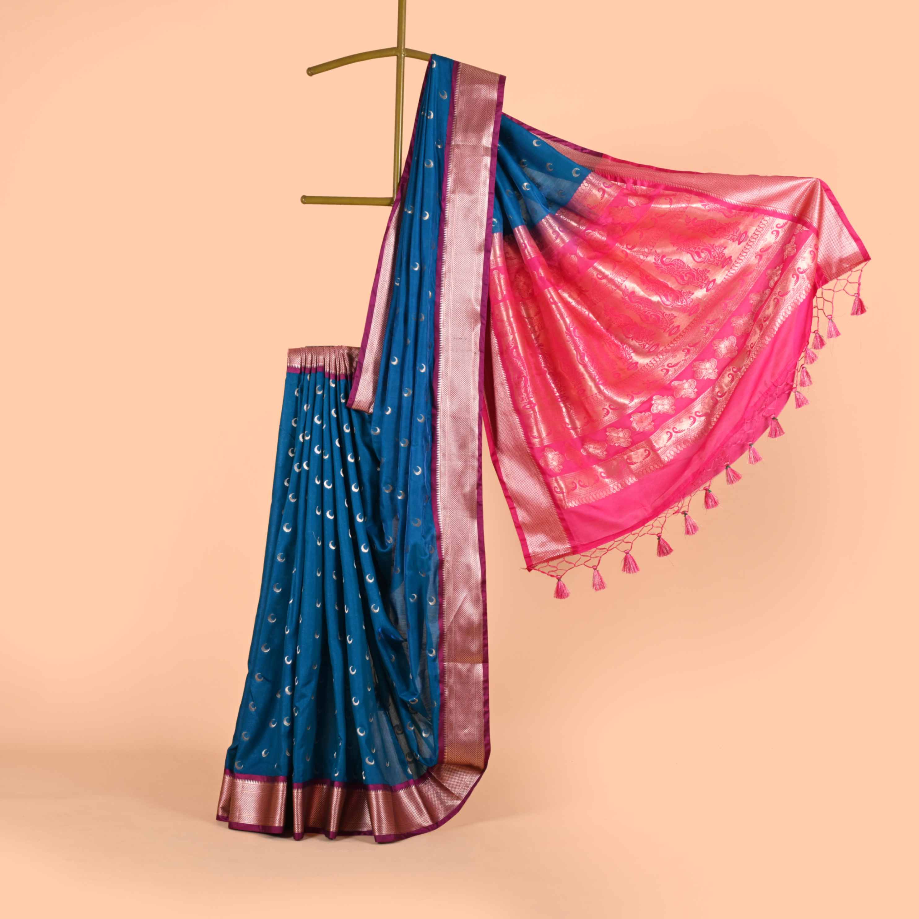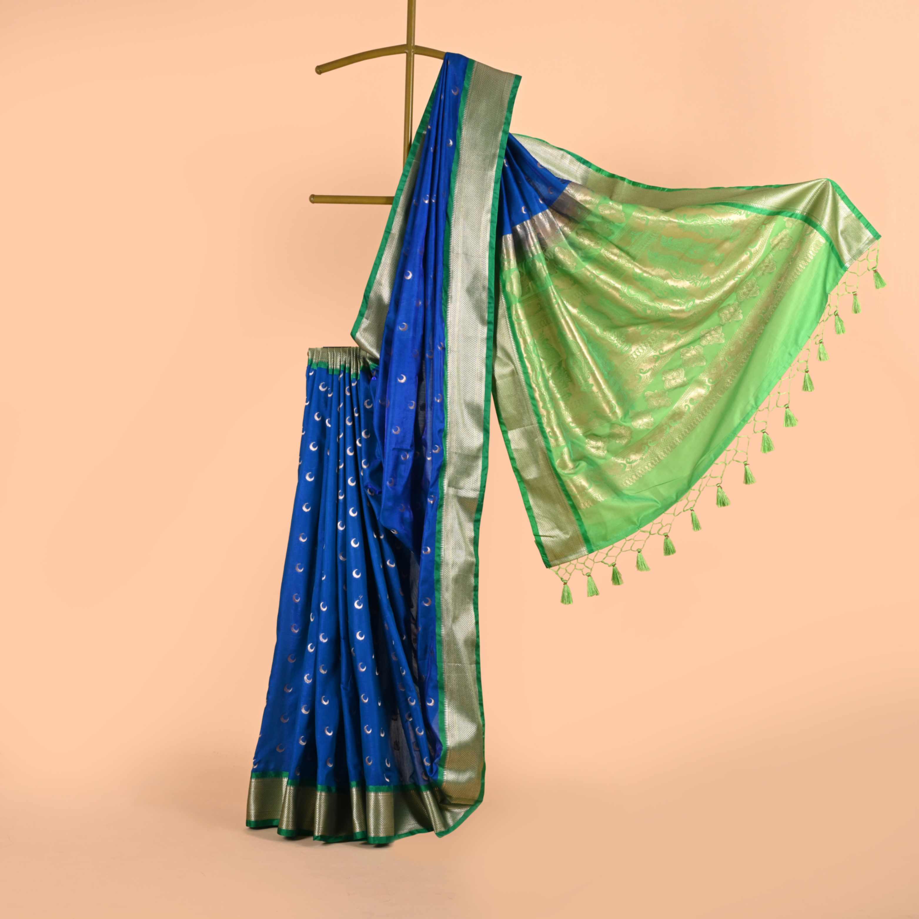 Illuminate your festive moments with the Chandra Prabha Zari Silk Saree. Adorned with graceful crescent moon motifs and intricate zari work, this saree blends celestial beauty with traditional elegance. The rich, vibrant colors combined with opulent zari borders make this saree a perfect choice for special occasions. Whether you’re attending a wedding or a festival, this saree ensures that you radiate charm and sophistication, embodying the serene beauty of the evening.