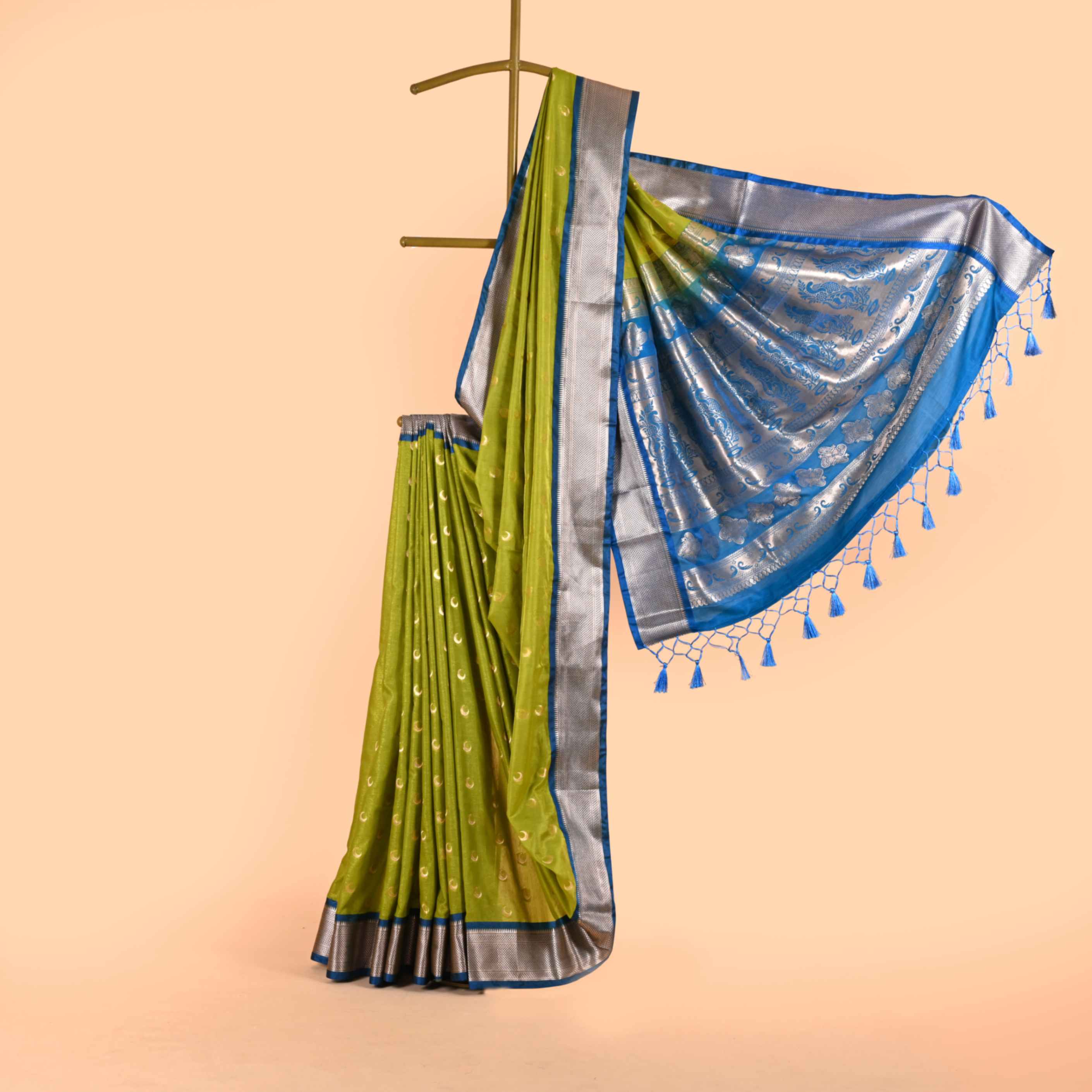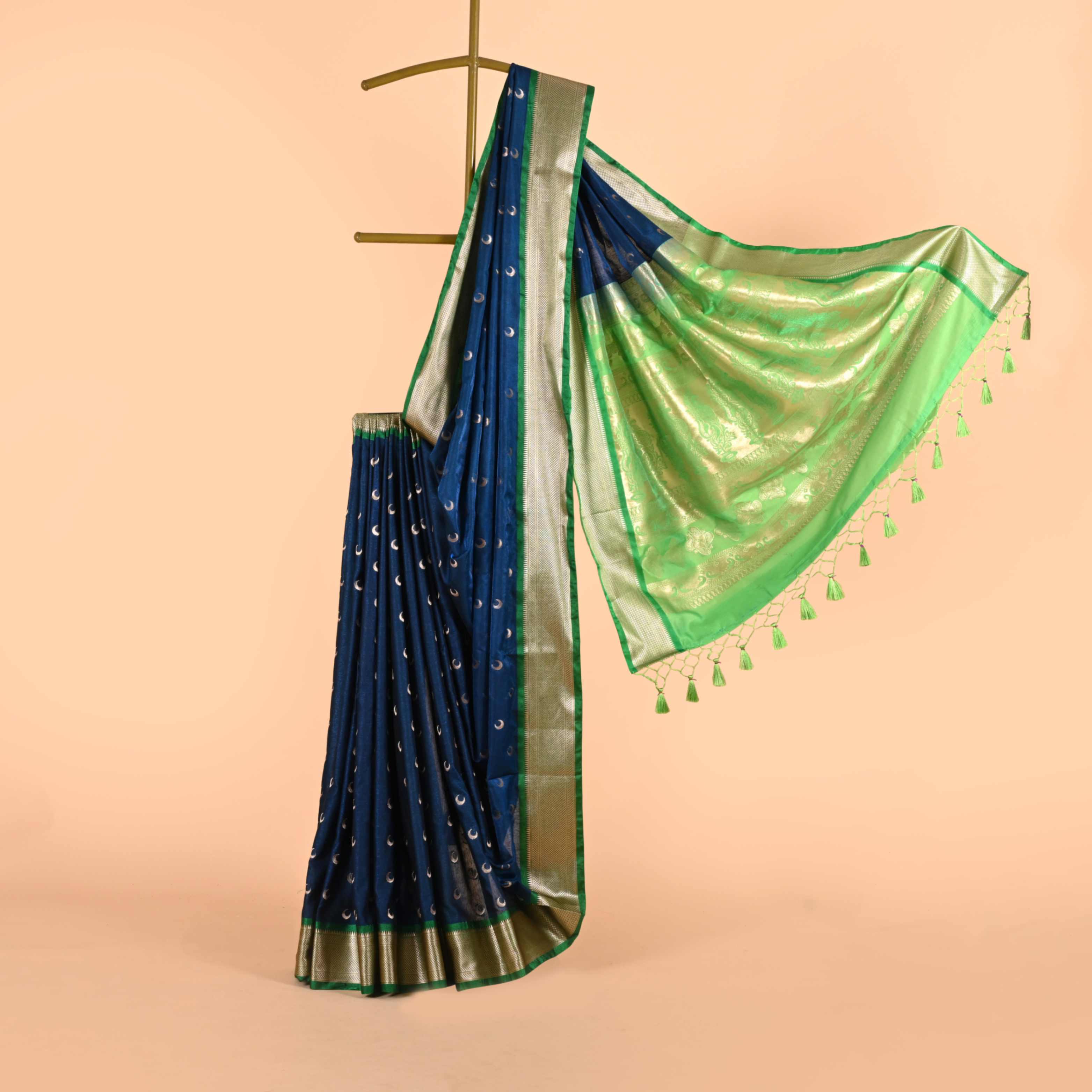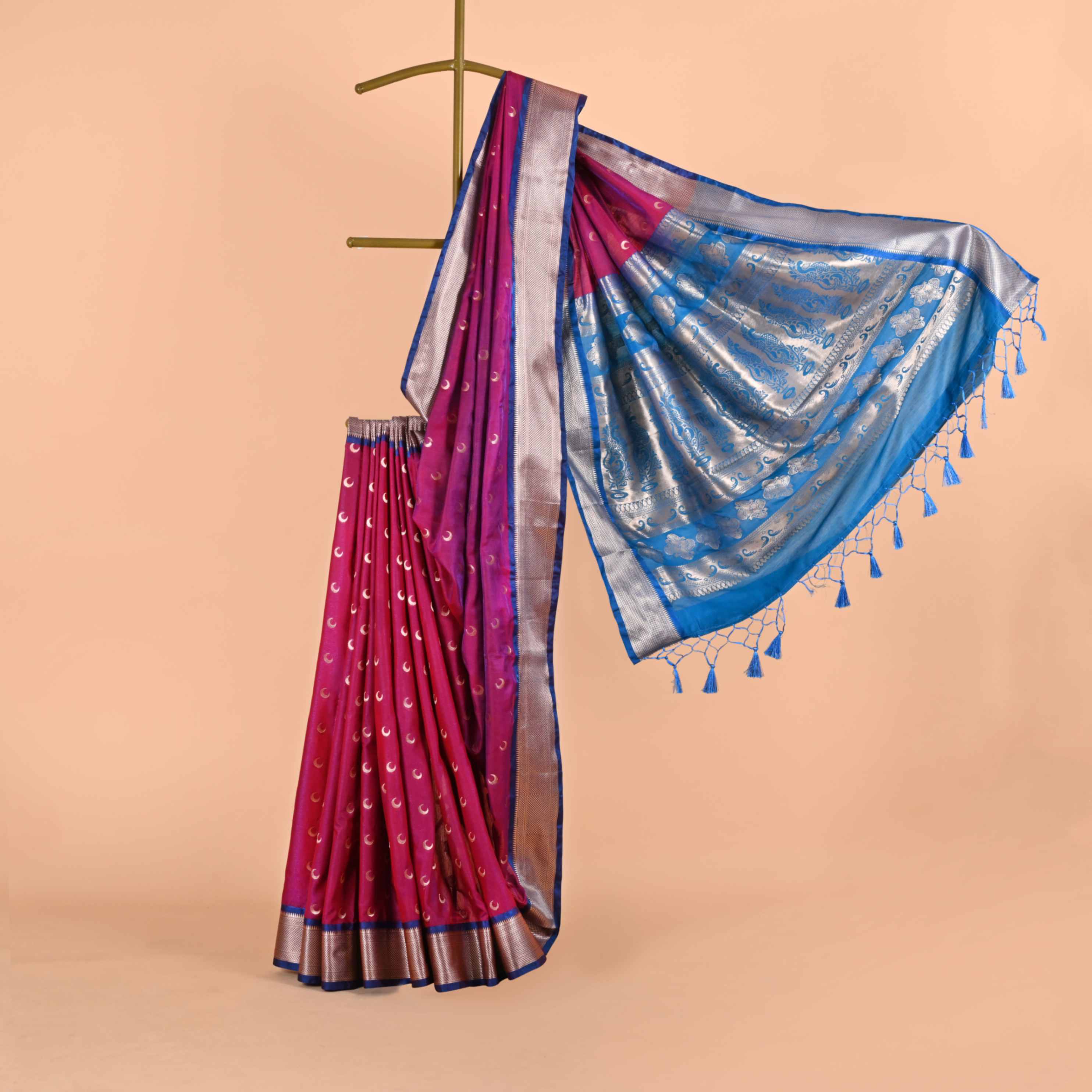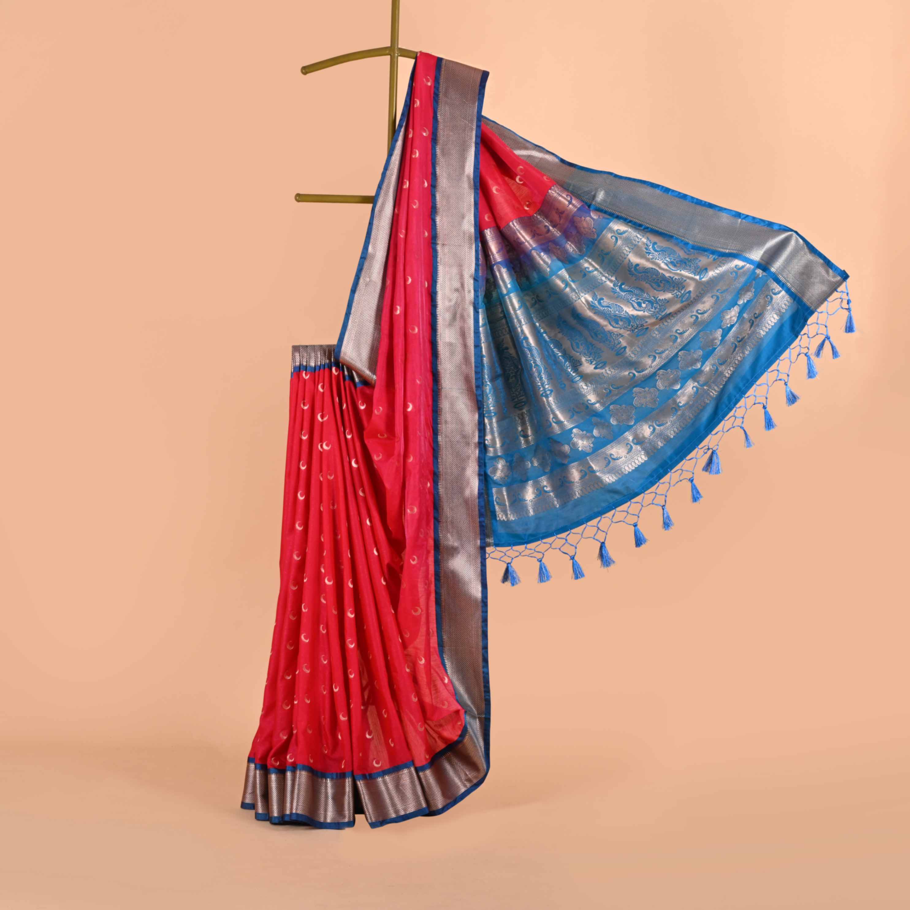 Illuminate your festive moments with the Chandra Prabha Zari Silk Saree. Adorned with graceful crescent moon motifs and intricate zari work, this saree blends celestial beauty with traditional elegance. The rich, vibrant colors combined with opulent zari borders make this saree a perfect choice for special occasions. Whether you’re attending a wedding or a festival, this saree ensures that you radiate charm and sophistication, embodying the serene beauty of the evening.