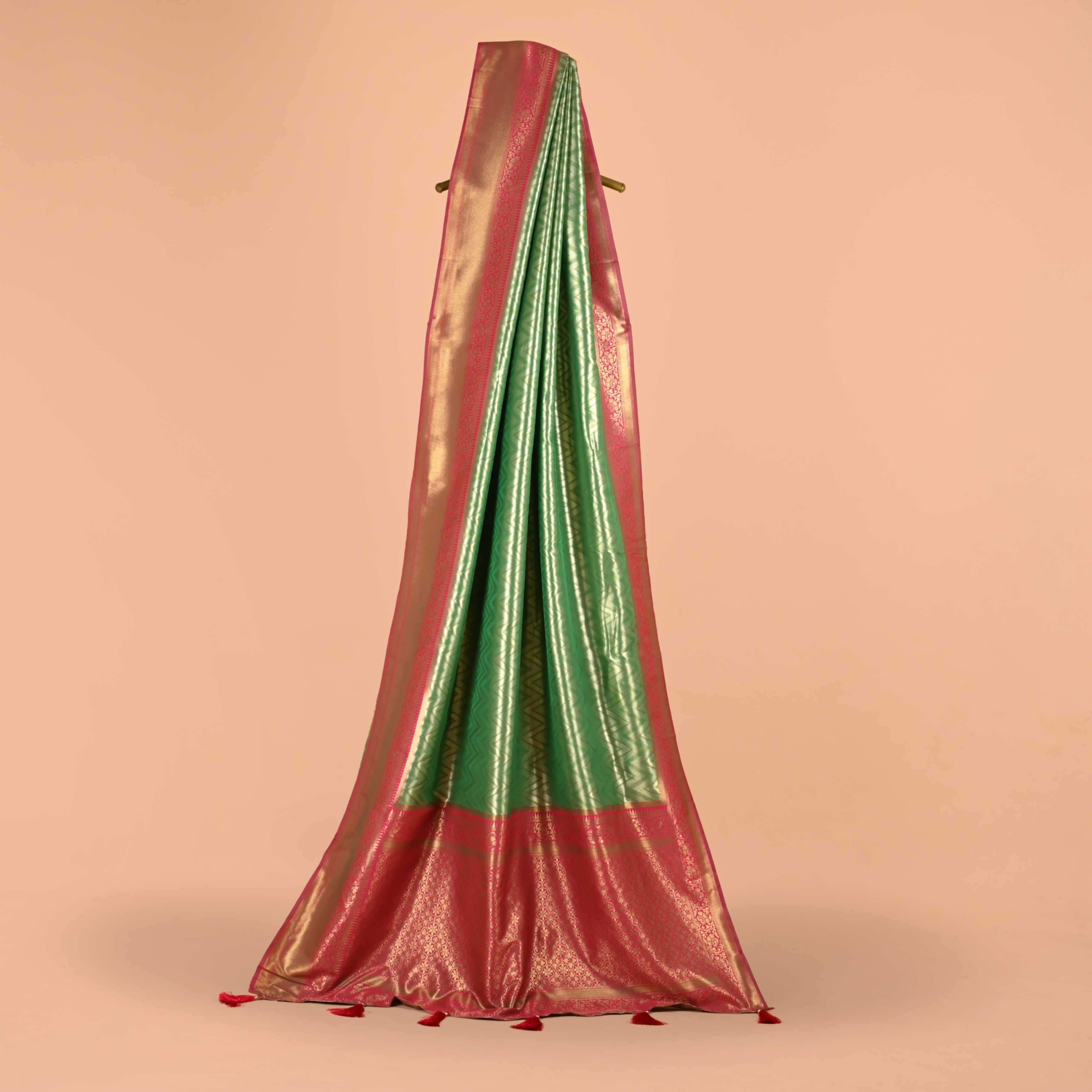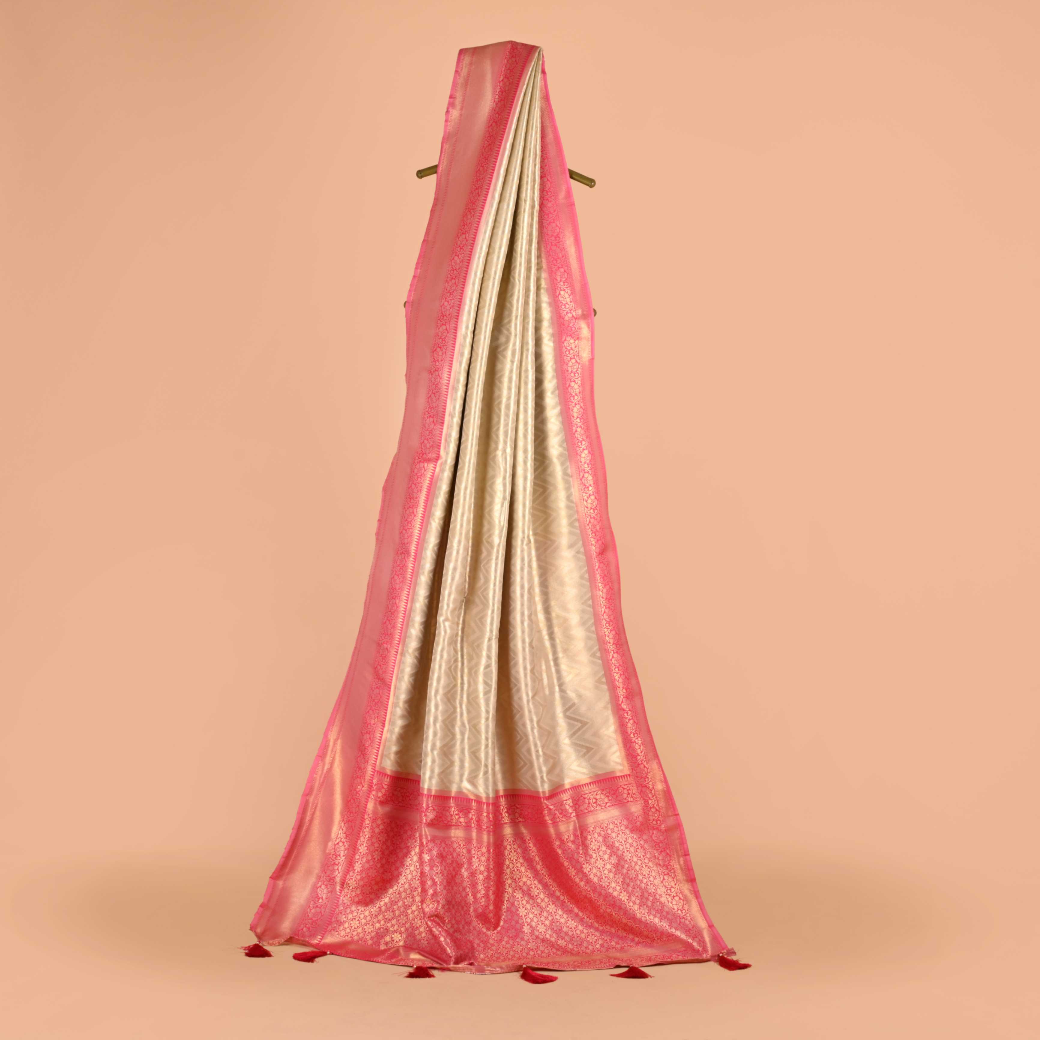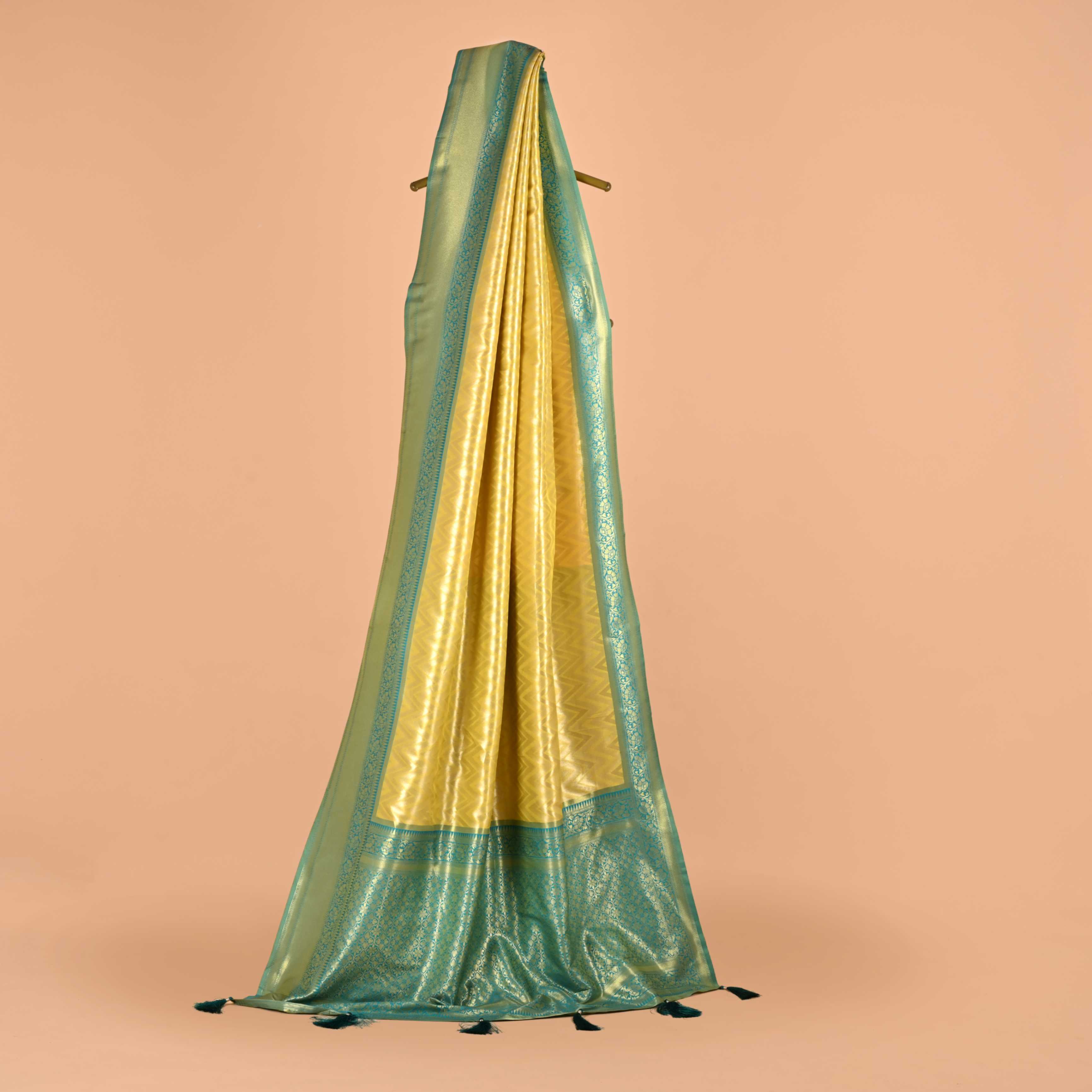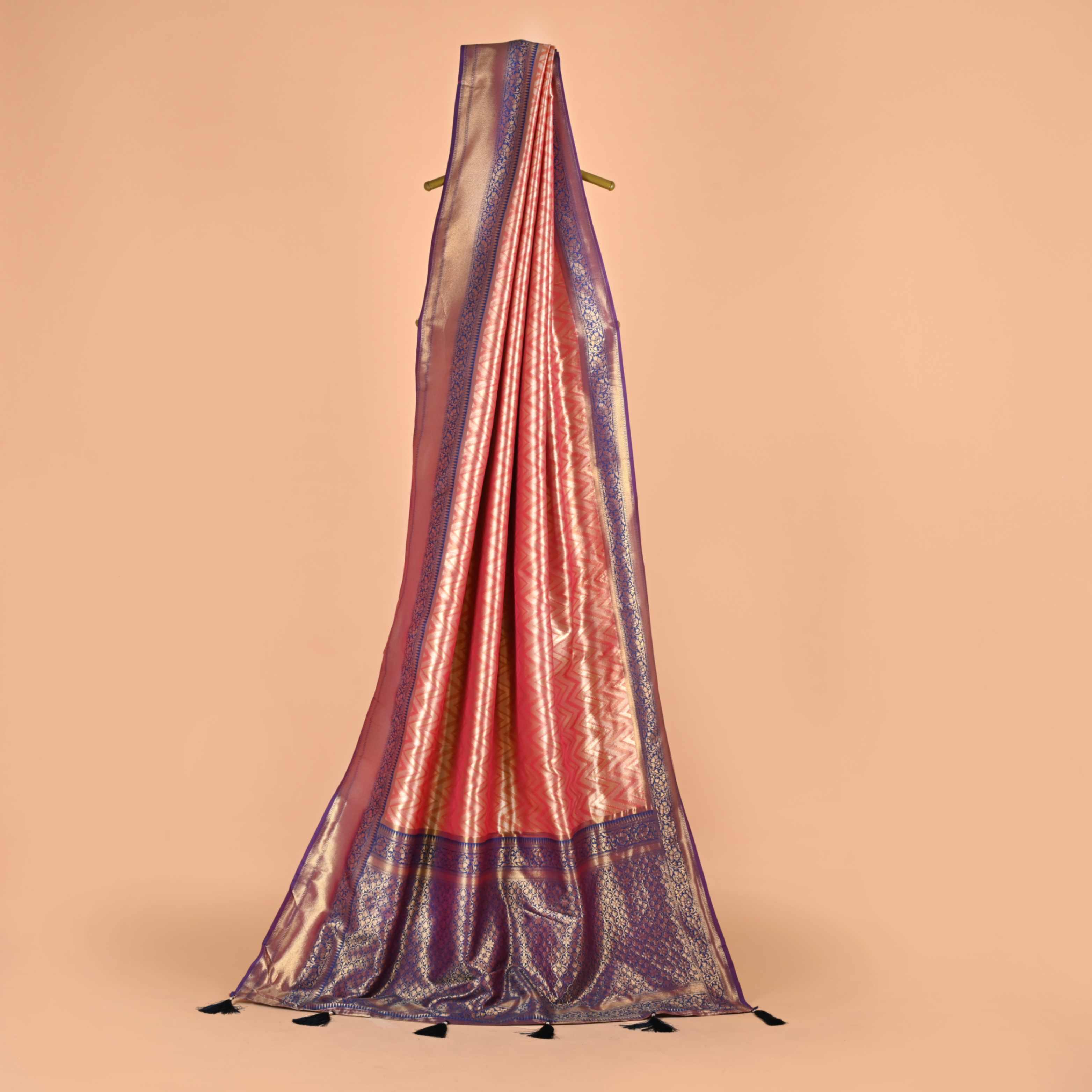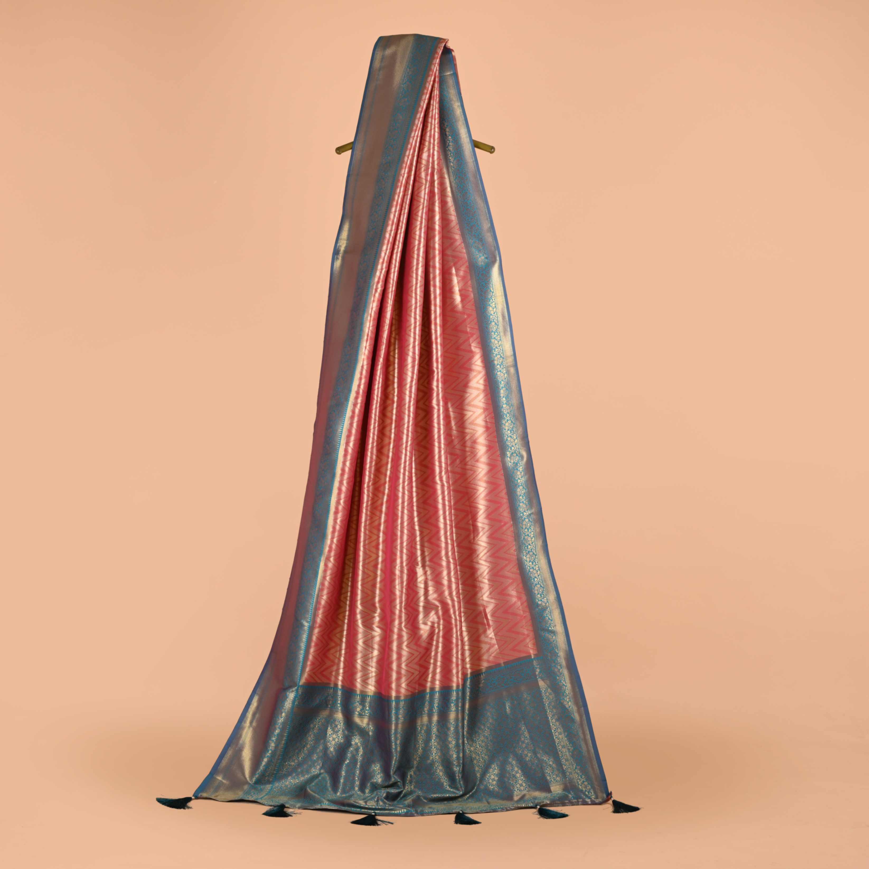 The Chevron Valli Zari Silk Saree features a striking chevron pattern woven in gold zari across a luxurious silk base. Complemented by ornate floral zari borders and a contrast pallu, this saree combines modern elegance with traditional grandeur, making it perfect for festive and special occasions.