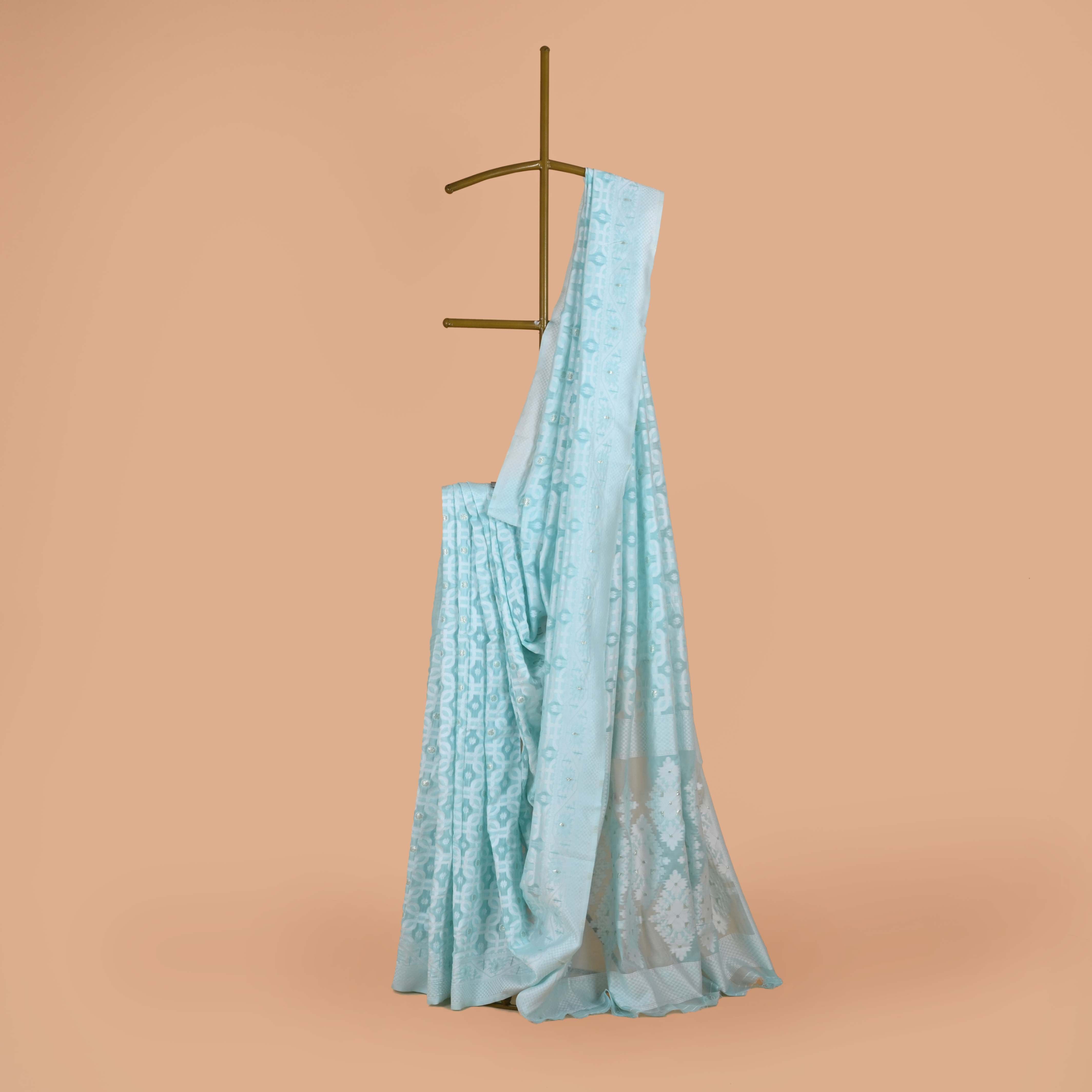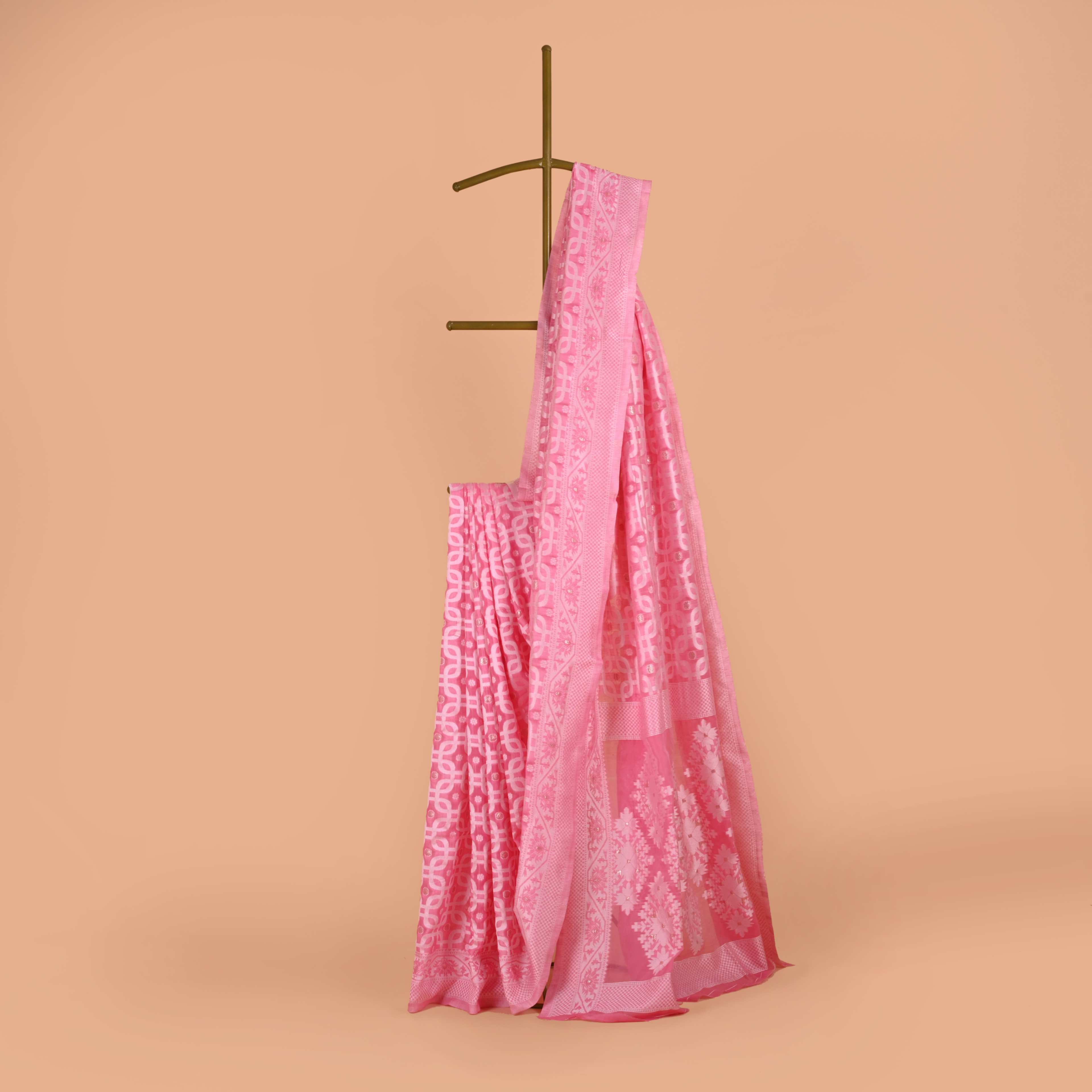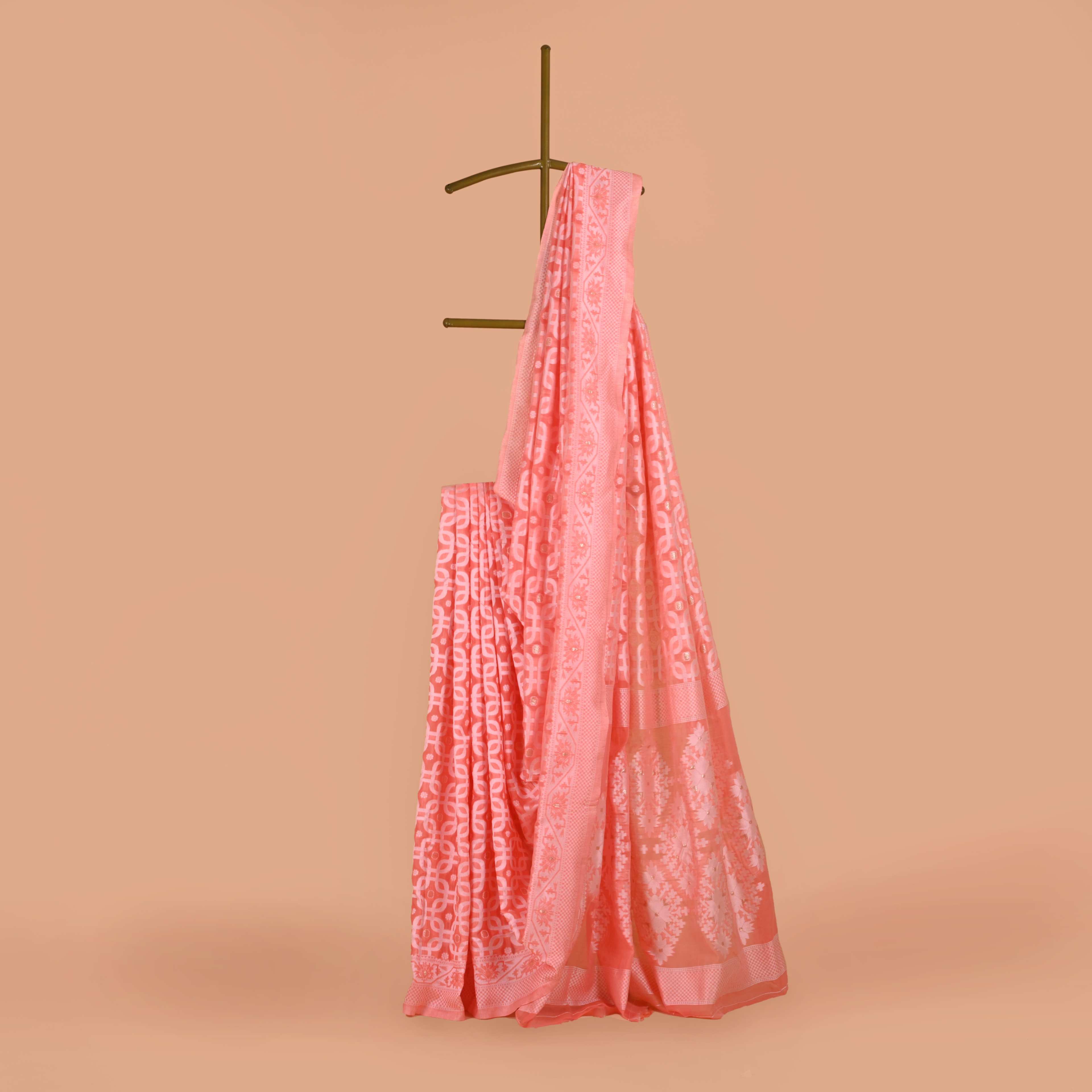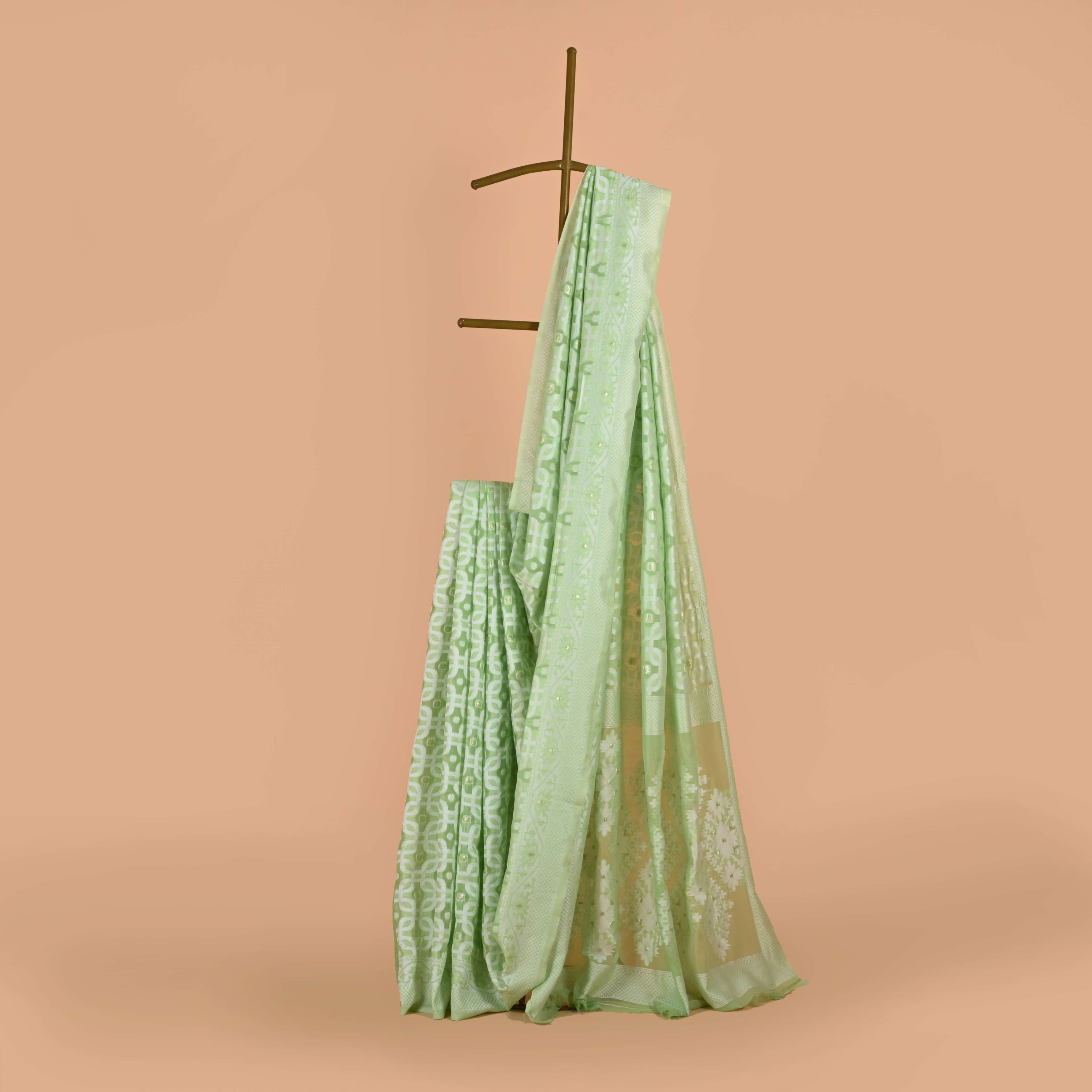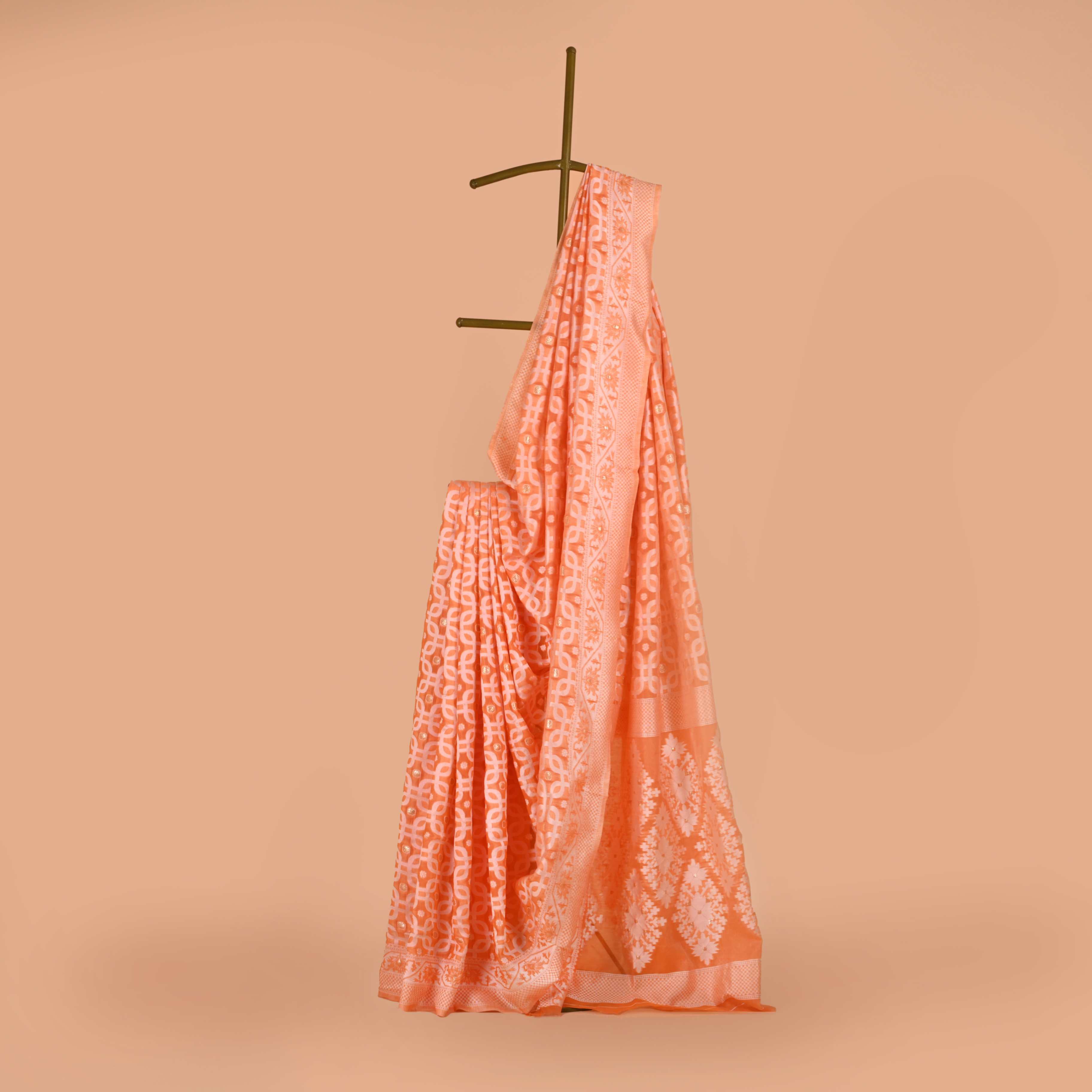 The Gulnari Lattice Cotton Saree features an elegant geometric lattice pattern interwoven across a lightweight cotton base. Complemented by subtle buti work and floral zari borders, this saree offers a refreshing blend of modern design and traditional craftsmanship, ideal for both festive and casual wear.