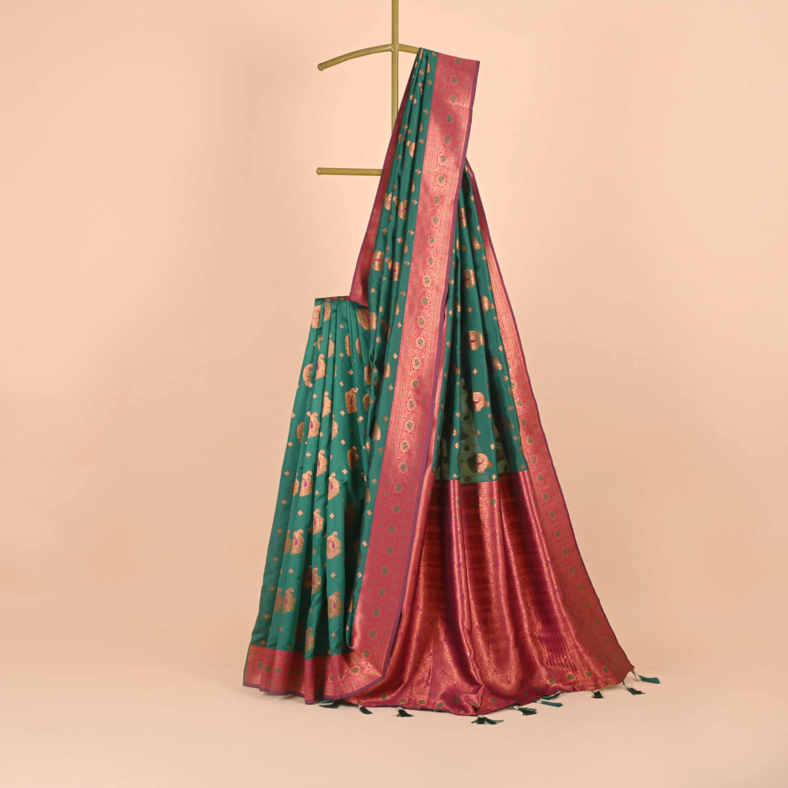 The Mastani Zari Silk Saree features bold motifs intricately woven in gold zari, complemented by vibrant accents on a luxurious silk base. The saree is adorned with richly detailed borders that enhance its traditional appeal. Available in deep, vibrant hues, this saree is perfect for weddings, festivals, and cultural celebrations.