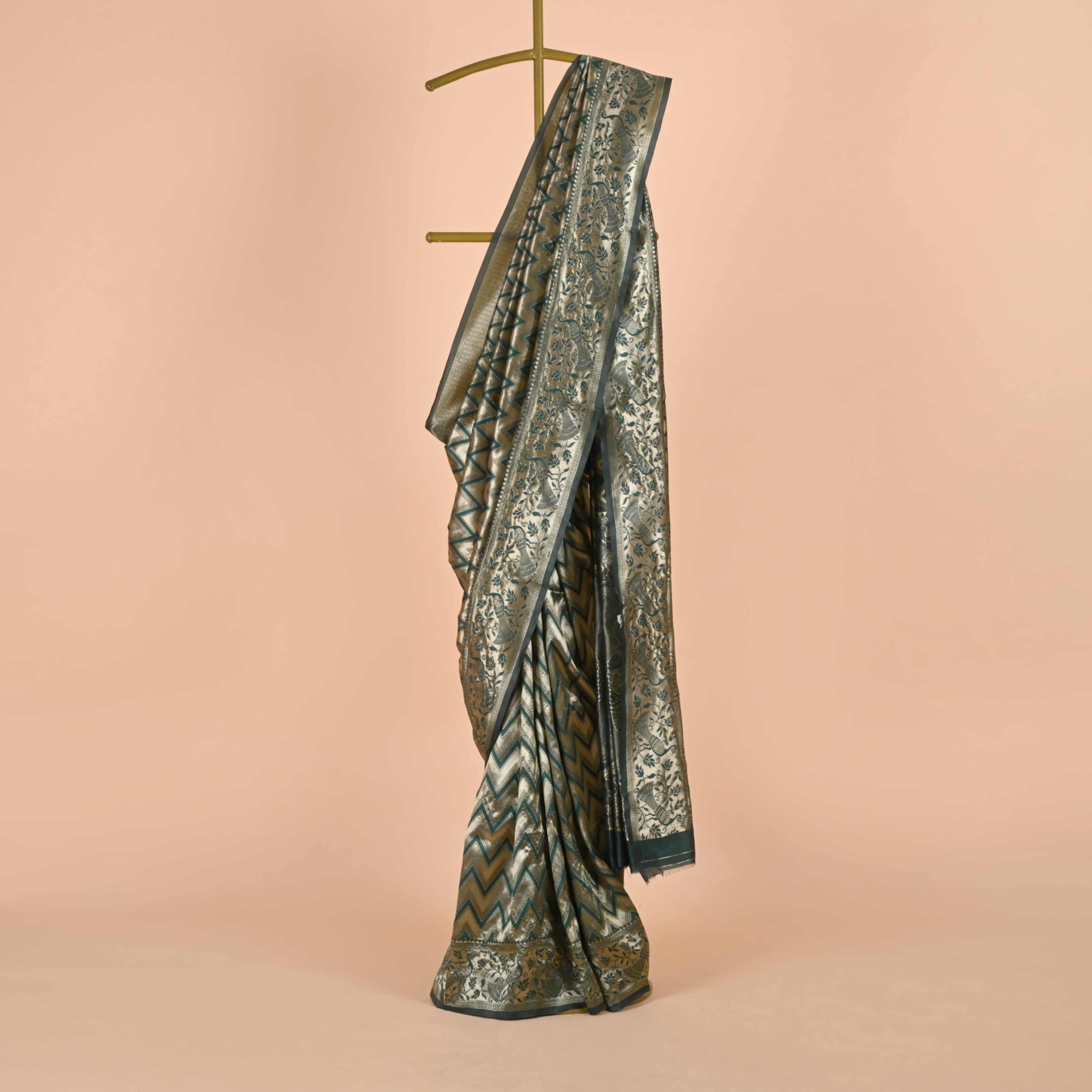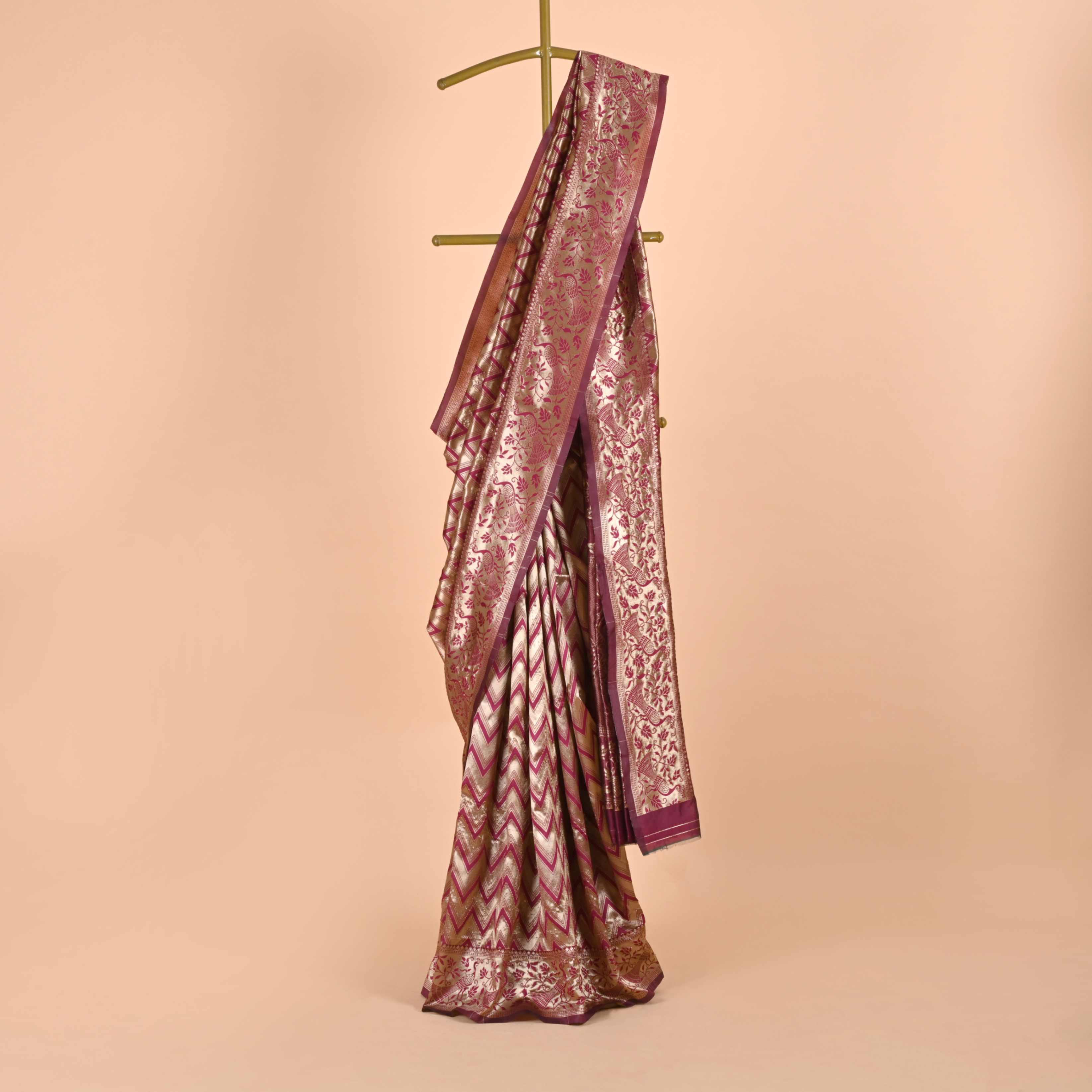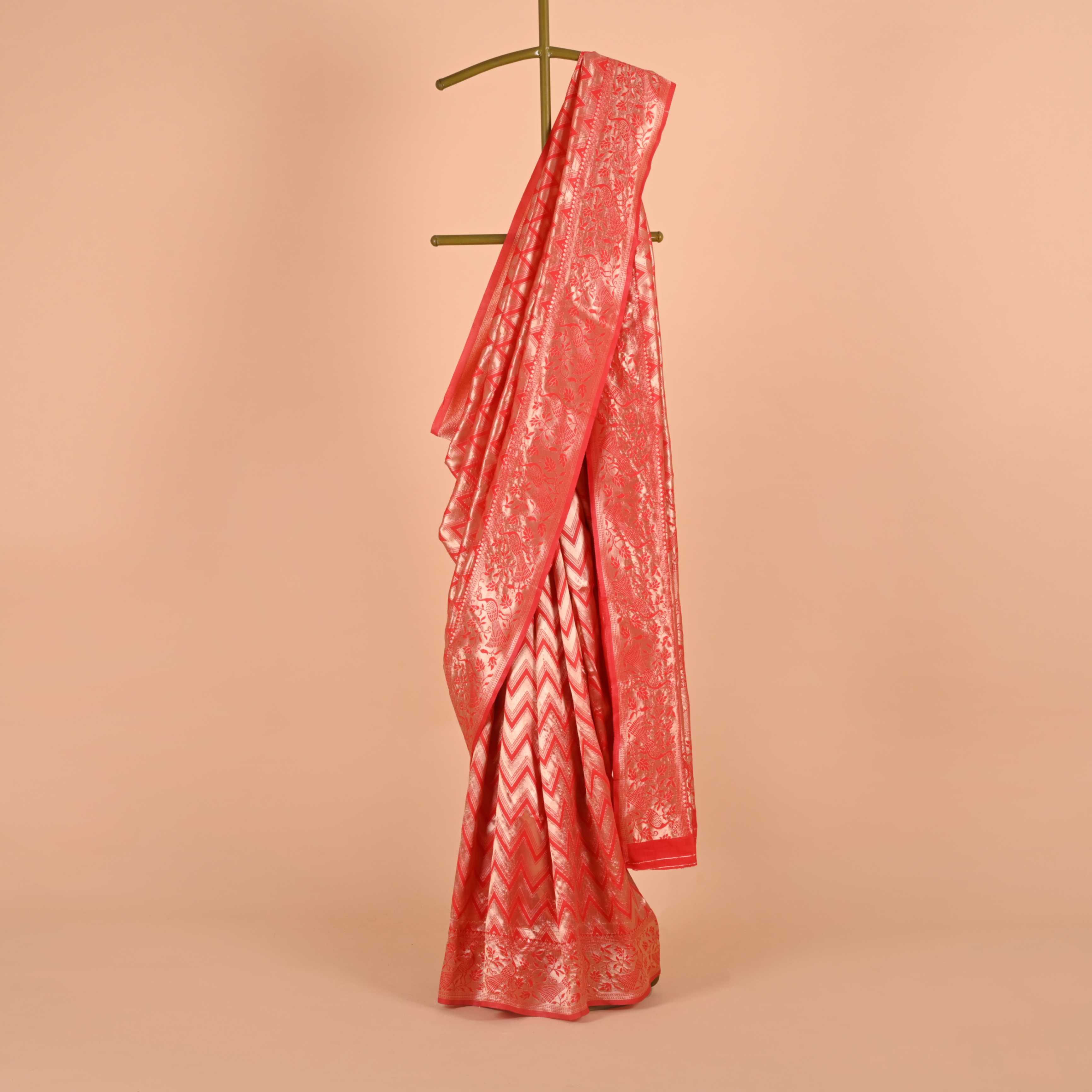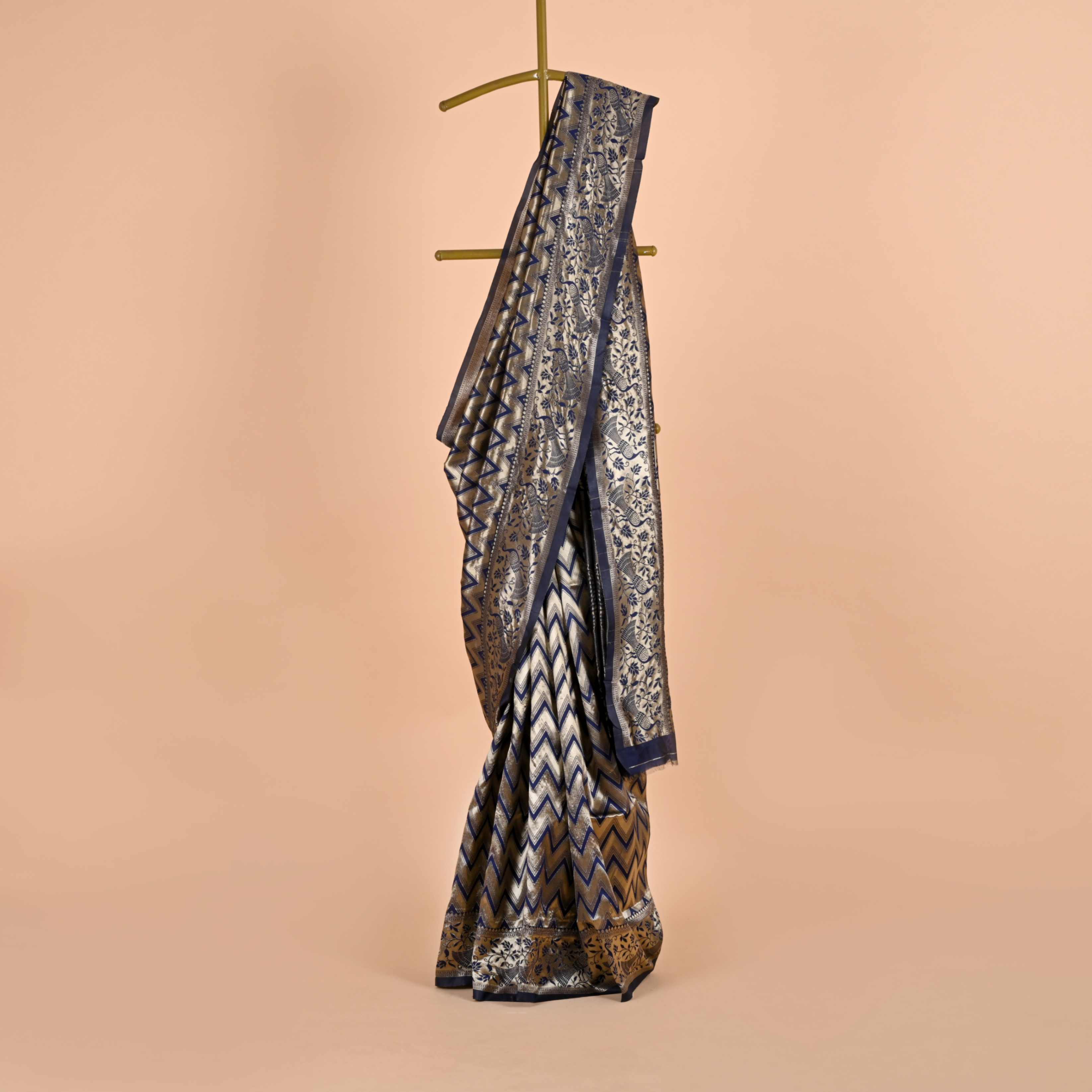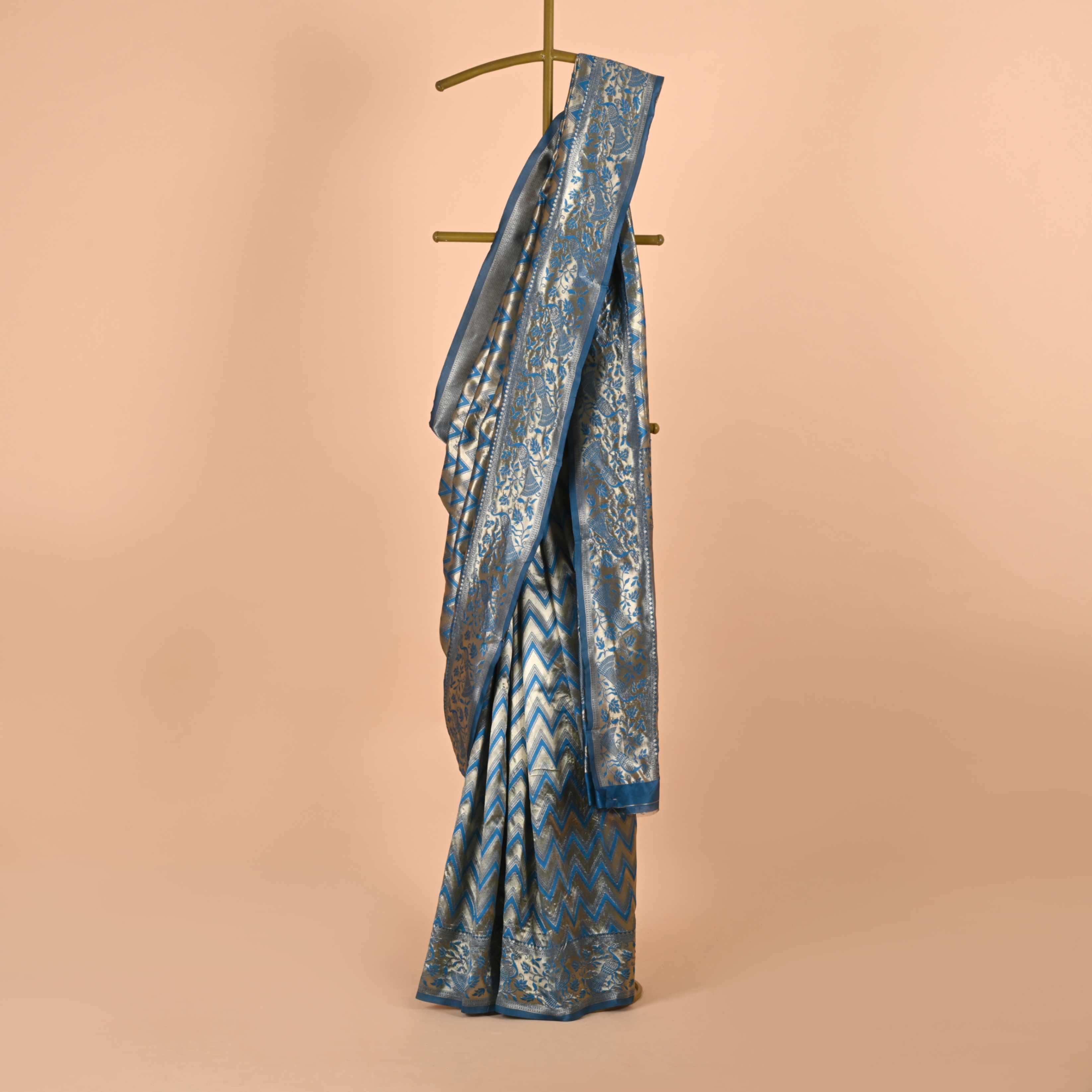 The Mayurika Zari Woven Silk Saree features a harmonious blend of traditional peacock border and bold chevron patterns, beautifully woven into luxurious silk fabric. Accentuated by rich zari borders and available in vibrant color combinations, this saree is a perfect choice for special occasions, embodying a blend of modern elegance and timeless tradition.
