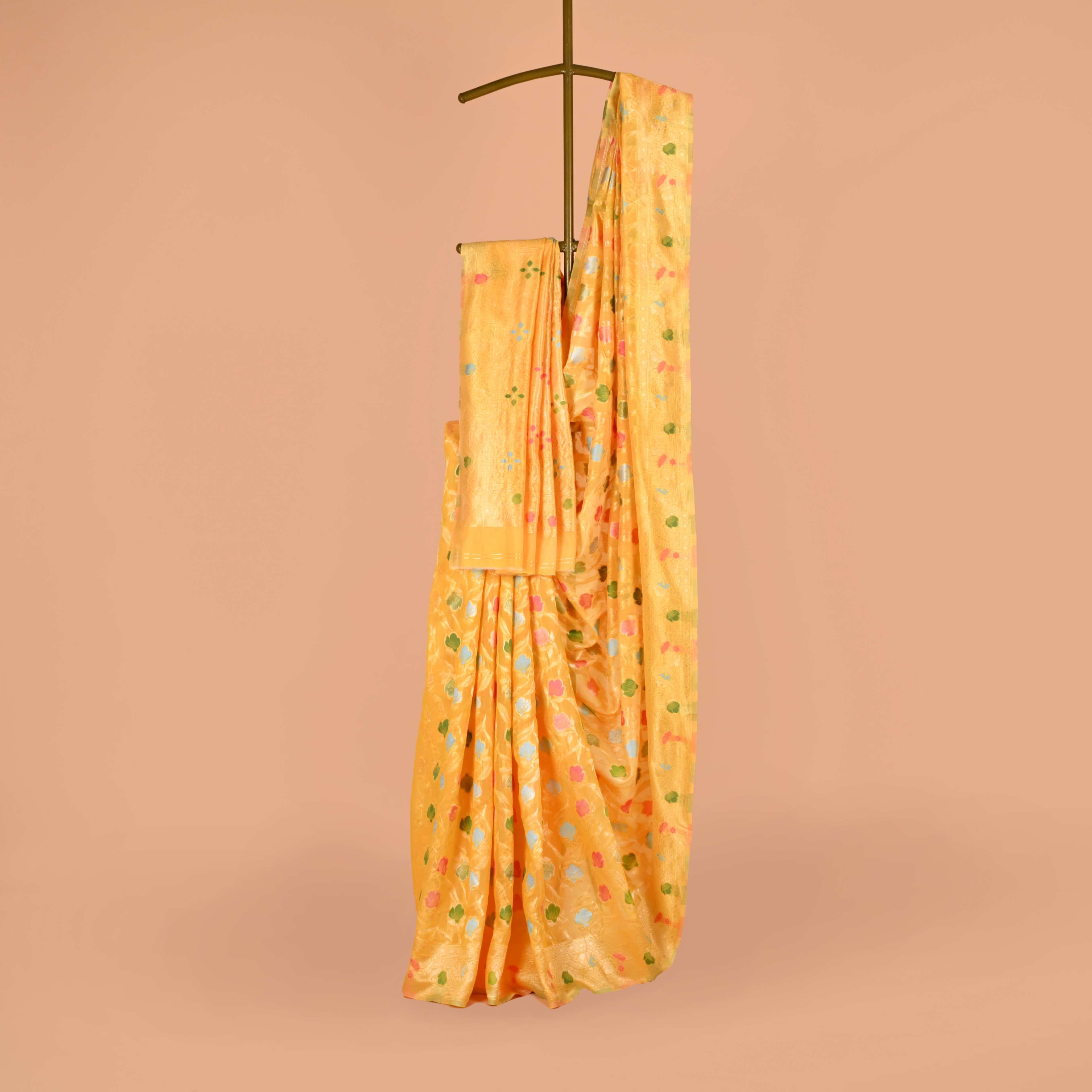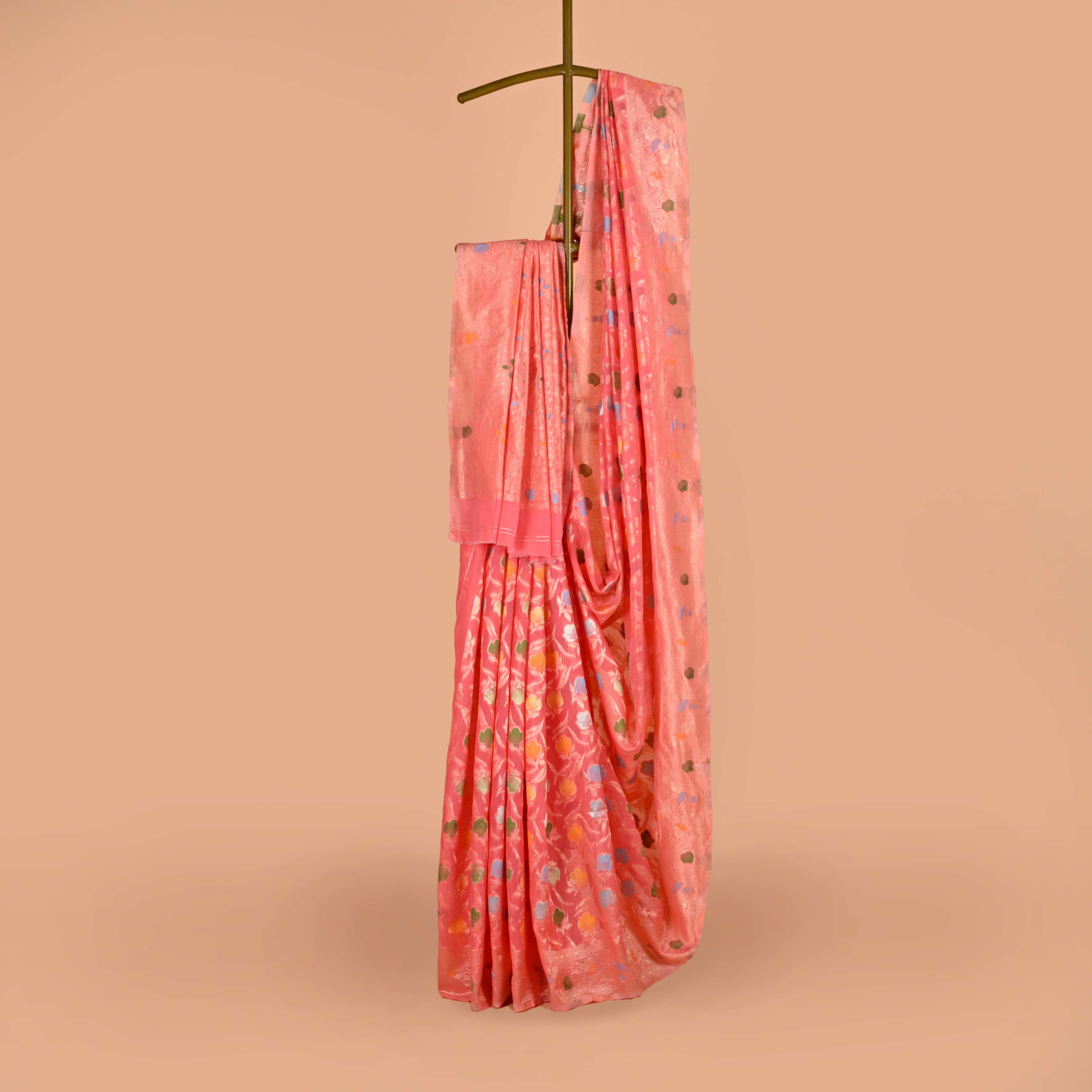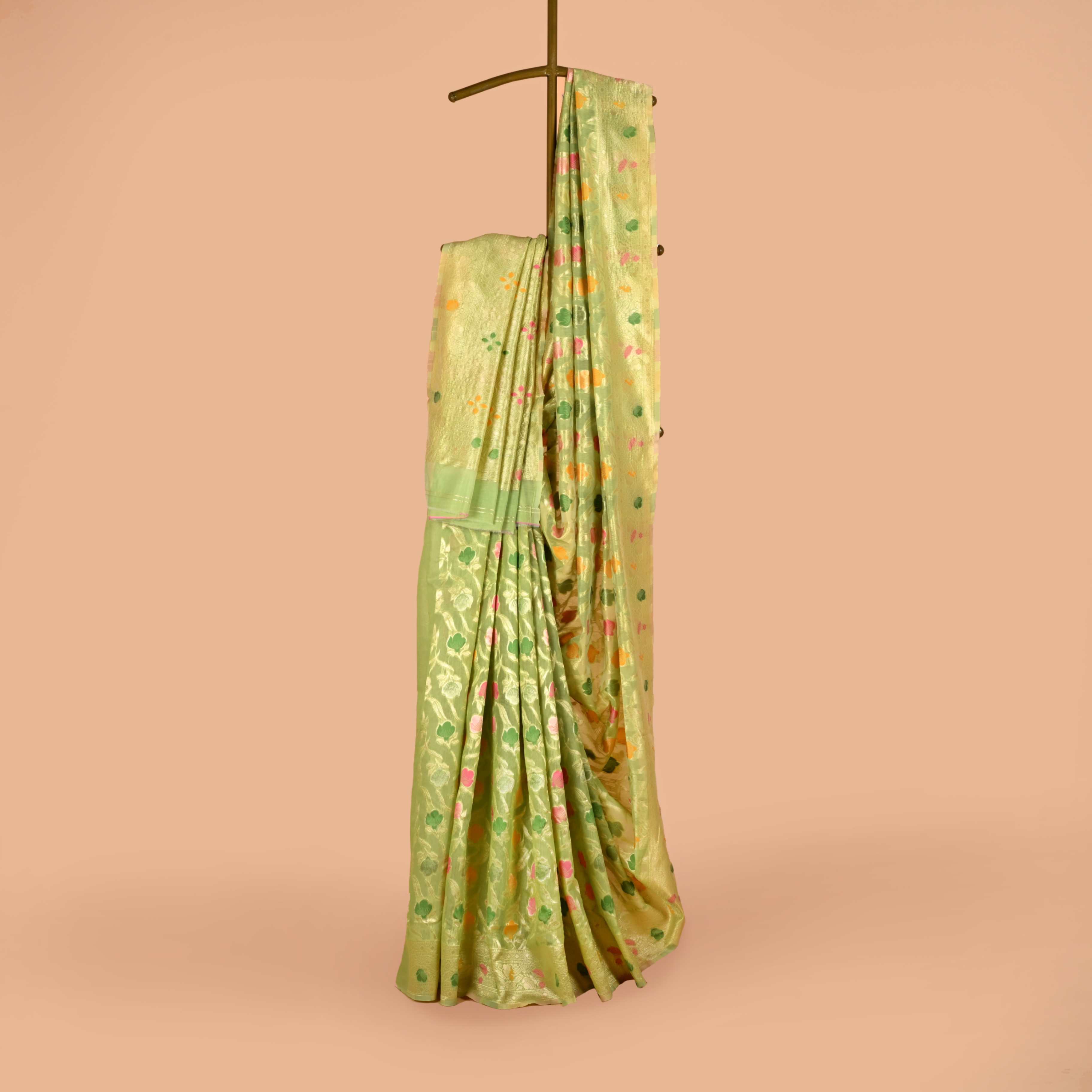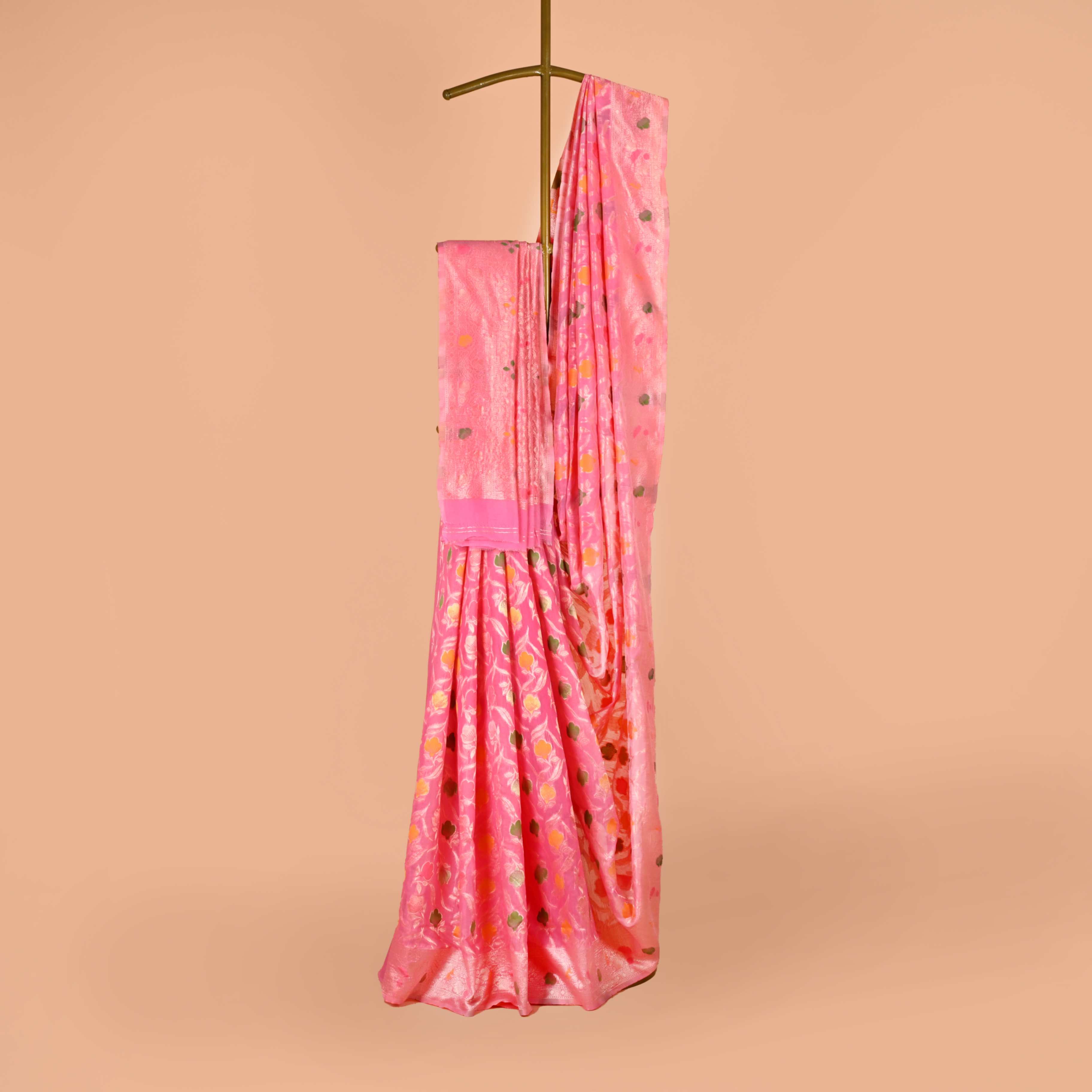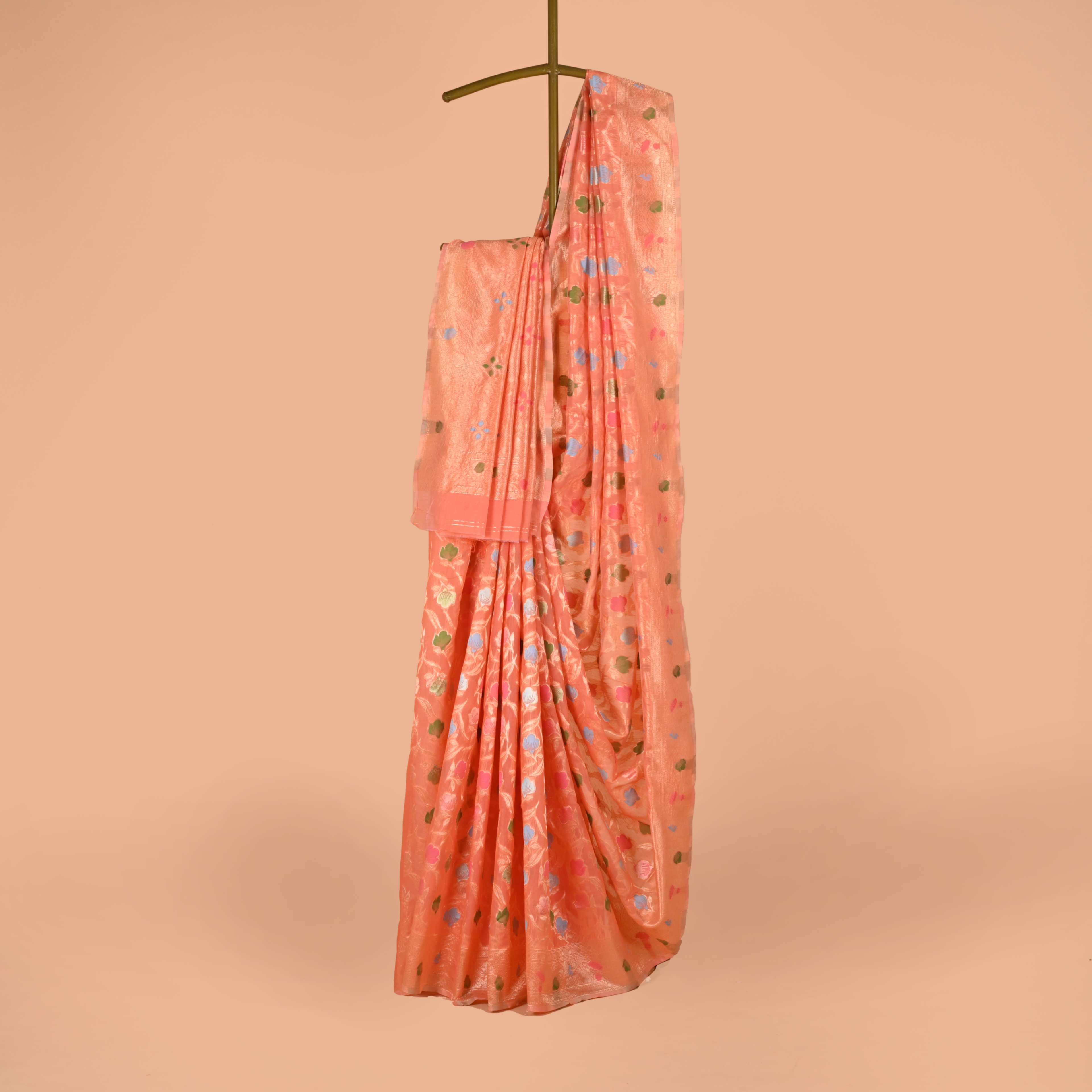 The Phoolwari Pastel Silk Saree is a delightful blend of tradition and modern charm. Adorned with colorful floral butis set against a backdrop of soft pastel shades, this saree is perfect for those who love to add a touch of vibrancy to their look. The traditional zari borders enhance its elegance, while the lightweight fabric ensures comfort throughout the day. Ideal for daytime celebrations and festive occasions, this saree brings a fresh, youthful spirit to your wardrobe. Available in a range of pastel colors, it’s a celebration of color and tradition.